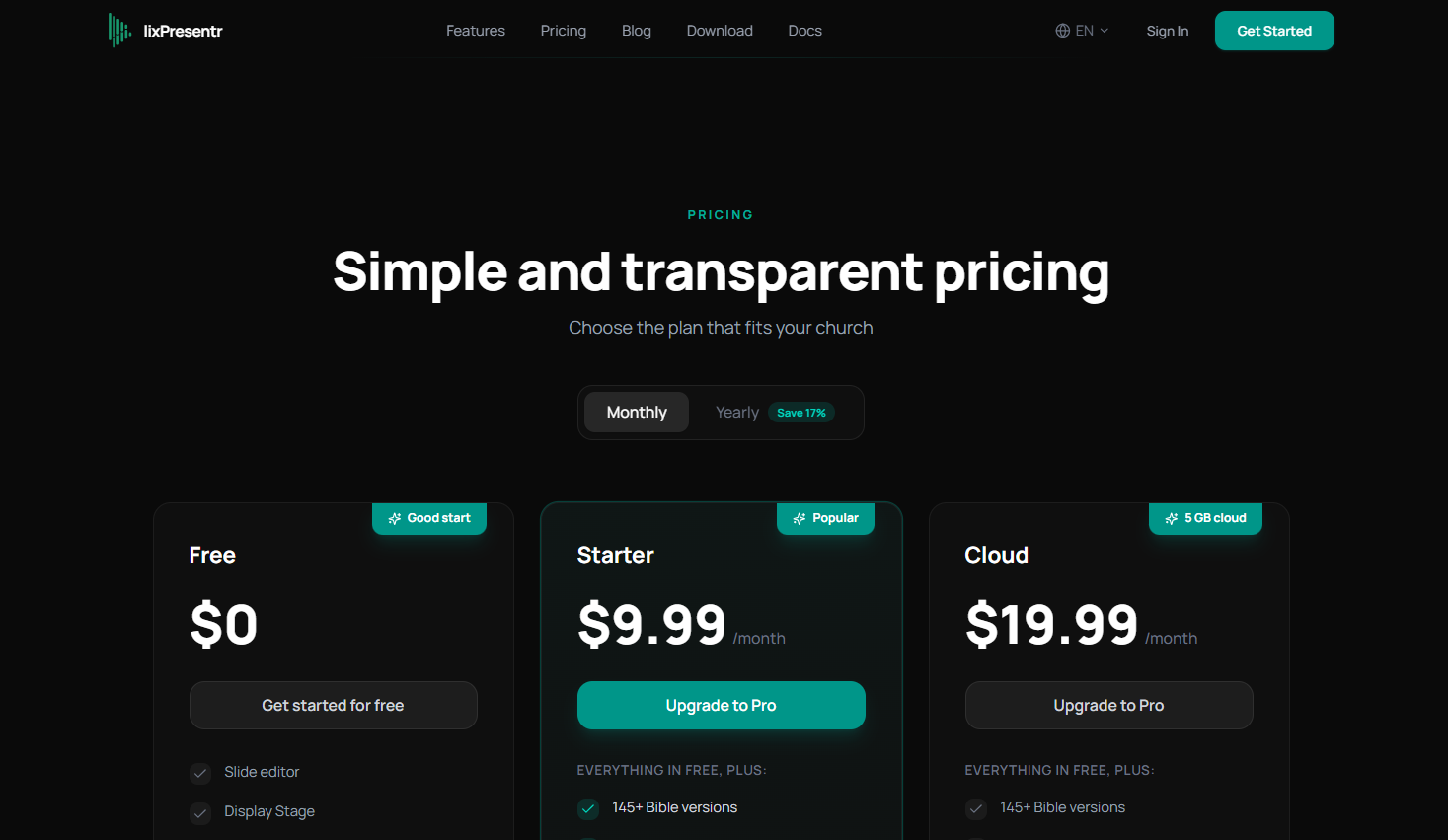 Depuis la page tarifs, sélectionnez le plan Pro (mensuel ou annuel). Le plan annuel offre environ 2 mois gratuits.