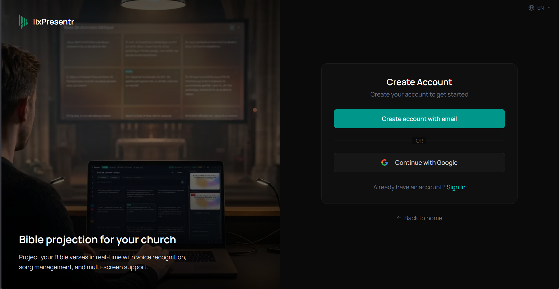 Rendez-vous sur lixpresentr.app/sign-up et créez un compte avec votre email ou Google.